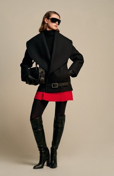 Ремень из гладкой кожи застегивается прямоугольной металлической пряжкой с закругленными углами. Аксессуар дополнили съемным кошельком с треугольным клапаном.