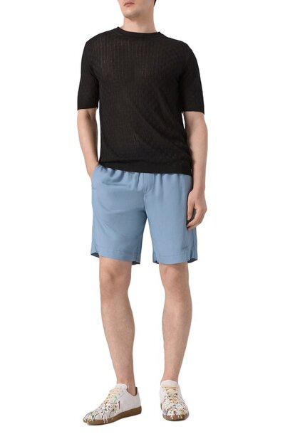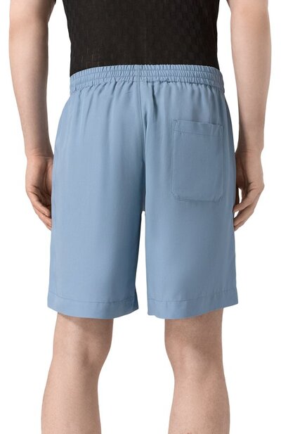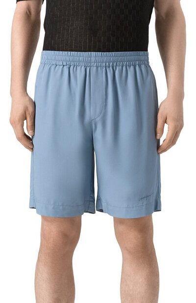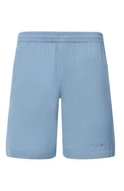 Шорты свободного кроя сшили из вискозной ткани. Модель с эластичным поясом, прорезными боковыми карманами и накладным задним украсили спереди вышитым логотипом в тон.