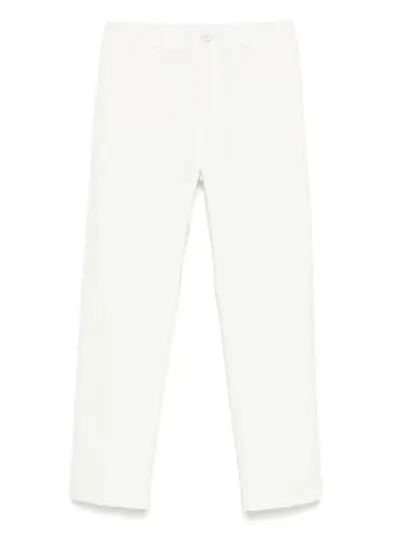 white elasticated waistband with internal drawstring front button and zip fastening two diagonal pockets to the sides two rear patch pockets