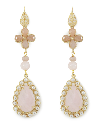 Эти серьги воплощают аристократическую утонченность и нежную женственность. Они выполнены в изысканном сочетании розового кварца и перламутровых акцентов, что создает элегантный и романтичный образ. Верхняя часть украшения начинается с филигранного элемента из золоченого металла, добавляющего изделиям структурную изящность и классическую красоту. Под ним расположена композиция из розовых ограненных кристаллов в форме клевера, которая добавляет серьгам мягкости и гармонии. Крупная подвеска в виде капли из розового кварца оформлена в золотой оправе и окружена мелкими жемчужинами, которые придают серьгам изысканный объем и дополнительное мерцание. Этот элемент служит выразительным акцентом, усиливающим общую элегантность украшения. Каминные бусины и изящные цепочки соединяют всю композицию, добавляя сережкам легкость и плавность в движении. Эти серьги — идеальный выбор для создания утонченного образа, они подчеркнут вашу женственность и утонченное чувство стиля, добавляя нотку романтического шарма вашему наряду.