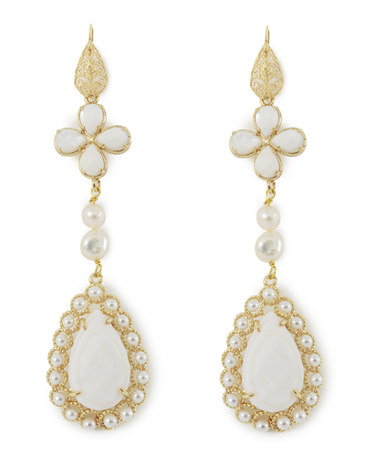 Эти серьги — воплощение ангельской элегантности и утонченности. Чистота белого цвета в сочетании с золотыми акцентами придаёт им благородный и свежий вид. Верхняя часть серёг украшена филигранным элементом из золоченого металла, добавляющим изделиям классической утонченности и структуры. Под ним размещена композиция в форме клевера, инкрустированная нежными молочно-белыми камнями, которые отражают свет мягким, нежным сиянием. Перламутровые бусины соединяют верхнюю часть с массивной каплевидной подвеской, выполненной из белого камня в золотой оправе. Окружение из мелких жемчужин придает идеально завершенный вид, создавая атмосферу аристократической изысканности. Эти серьги идеально подчеркнут утонченные вечерние образы, добавив их обладательнице дополнительный шарм и изысканность. Они акцентируют внимание на вашем безупречном вкусе, становясь ключевым элементом в создании образа чистоты и элегантности.