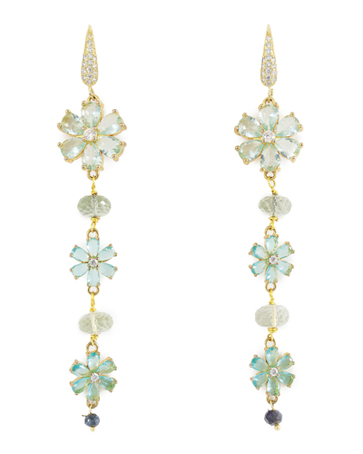 Эти серьги — воплощение воздушной свежести и утонченной игривости, благодаря своему легкому и воздушному дизайну. Их уникальная композиция и изящные детали создают образ, наполненный элегантным очарованием и романтическим настроением. Каждая серьга начинается с изящного крепления, украшенного россыпью мелких сверкающих кристаллов, которые придают изделиям мерцающий эффект и подчеркивают их изысканность. Цветочные элементы, выполненные из прозрачных и полупрозрачных камней нежно-зеленого оттенка, создают иллюзию цветочного букета. Огранка камней мастерски выполнена, что предоставляет возможность свету проникать сквозь них и создавать впечатляющее сияние. Между цветами расположены деликатные бусины светлого оттенка, добавляющие серьгам динамичность и утонченность. Завершают композицию небольшие цветочные элементы, удерживаемые на изящных золотых цепочках, придавая украшениям пленительный шарм. Эти серьги идеально подойдут для романтичного образа, добавляя нотки легкости и утонченной грации. Они акцентируют внимание на вашей элегантности и утонченном стиле, привнося свежесть и неповторимый блеск в образы.