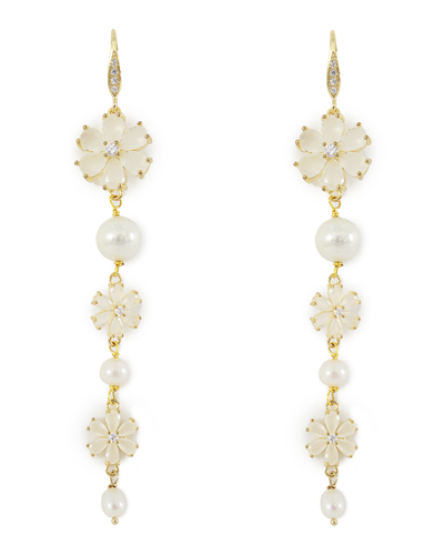 Эти серьги — изящная гармония нежности и утонченной роскоши, воплощенная в филигранном дизайне. Они сочетают в себе невинность жемчужин и элегантность цветочных мотивов, создавая идеальный аксессуар для романтичных и стильных образов. Каждая серьга начинается с изысканного крепления, украшенного небольшими сверкающими кристаллами, которые добавляют утонченной воздушности и привлекают свет. Цветочные мотивы, выполненные из полупрозрачных лепестков, создают ощущение легкости и женственности. В центре каждого цветка расположен сверкающий камень, который добавляет акцент мерцающего блеска. Жемчужины, расположенные между цветочными элементами, придают серьгам классическую элегантность и утонченность, идеально контрастируя с нежными цветами. Подвешенные на изящные золотистые цепочки, эти элементы двигаются с легкостью, создавая живой и динамичный образ. Серьги завершены маленькими жемчужными акцентами, которые добавляют завершающий штрих и делают изделие гармоничным. Эти серьги наполнят ваш образ мягкостью и изысканным шармом.