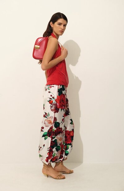 Брюки с широким эластичным поясом и боковыми карманами сшили из шелкового атласа с крупным цветочным принтом. Модель с узким однотонным кантом составит образ в пижамном стиле с парным жакетом.