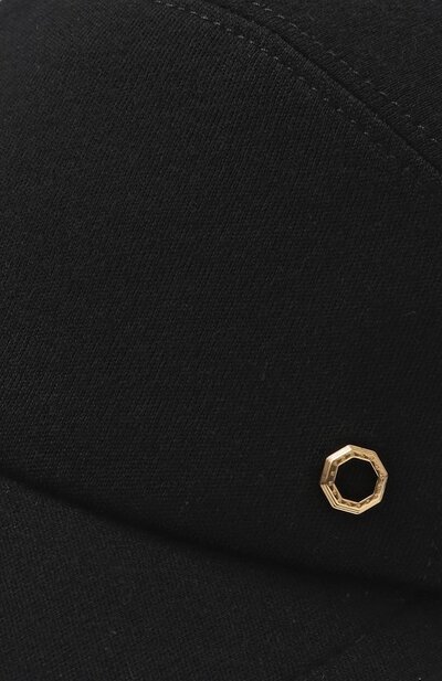 Бейсболку из шерстяного трикотажа украсили слева золотистой заклепкой-октагоном с эмалевой вставкой в тон. Декору вторит брендированная пластина над эластичным ремешком сзади.