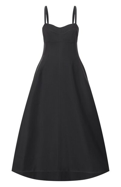 Платье-бюстье с фигурным лифом и узкими бретелями сшили из габардина на основе полиамида с добавлением шелка. Модель с ассиметричным низом застегивается молнией сзади.