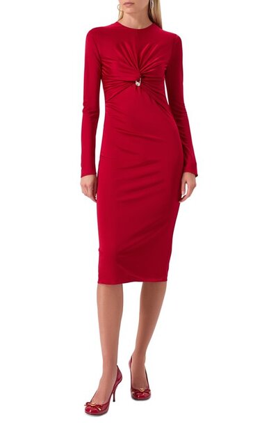 Драпировку облегающего миди-платья подчеркнули фирменной булавкой Safety Pin. Модель из вискозного джерси с атласным блеском застегивается молнией сзади.