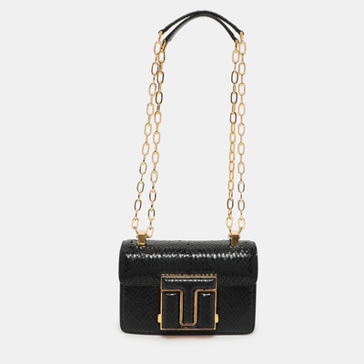 Immerse yourself in the allure of Italian craftsmanship with Tom Fords exquisite creation. This chic shoulder accessory boasts python embossed leather, delivering an edgy twist to timeless elegance. Its sleek black facade is complemented by a sophisticated T clasp, exuding understated luxury. Designed for the modern woman, the plush leather interior safeguards essentials with grace. Embrace exclusivity and elevate your style quotient with this must have piece from a celebrated designer. A true embodiment of sophisticated fashion.