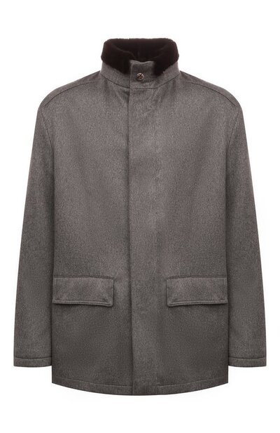 Мастера неаполитанской марки из семьи Kiton сшили серое укороченное пальто из нежного легкого кашемира. Для производства материала использовали вычесанный вручную и промытый в ключевой воде пух горных коз, поэтому он отлично сохраняет тепло. Чтобы в модели было комфортно даже в морозы, ее дополнили съемным подкладом из густого шелковистого меха нутрии, который считается одним из самых долговечных и не боится влаги.