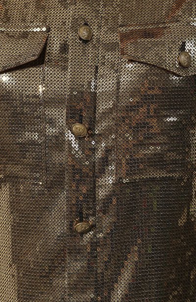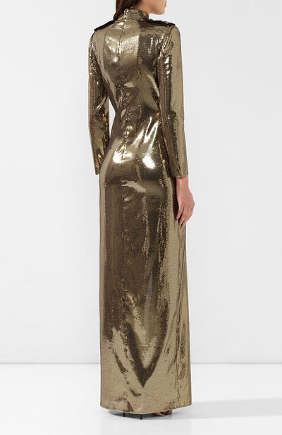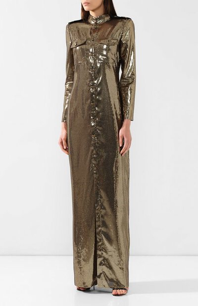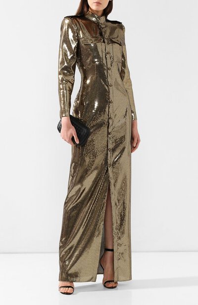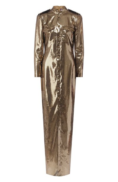 В сезоне весна-лето Ральф Лорен придумал еще один способ сиять ярче — золотистое платье, полностью расшитое мерцающими пайетками, которые создают wow-эффект. Для изготовления вещи мастера марки использовали тонкий мягкий текстиль. На плечах — широкие декоративные погоны. На показе модель дополнили сверкающим поясом в тон, а наши стилисты предлагают оттенить активный характер изделия аксессуарами черного цвета.