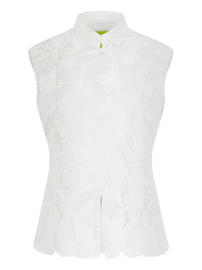 white high collar floral pattern scalloped hem button closure fitted silhouette