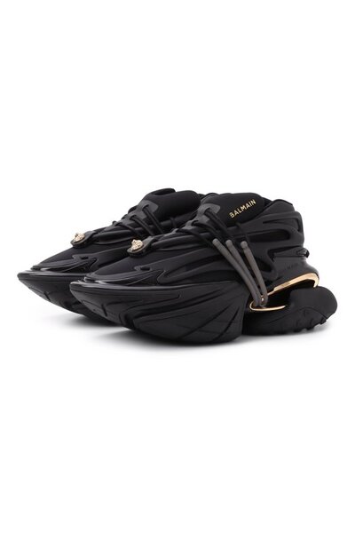 Кроссовки Unicorn из неопрена укрепили полимерными фигурными накладками. Петли для шнуровки модели пропустили через овальный вырез на футуристичной рельефной подошве. Пяточный стабилизатор изделия с тисненым логотипом дополнили петлей с брендированным цилиндром, а клапан на союзке — медальоном Lion Head.