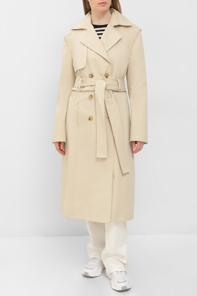 Песочный тренч Patrizia Pepe с отстёгивающимися рукавами и нижней частью. Функциональная модель-трансформер 3 в 1 сшита из мягкого хлопкового габардина. Конструкция двубортного изделия характеризуется застёжкой на крупные роговые пуговицы и наличием классической складки и центральной шлицы сзади. Благодаря потайным застёжкам-молниям с пуллерами Fly модель можно носить как длинный тренч, жакет или короткий жилет, что позволяет легко адаптировать её к любому сезону. В шлевки продет широкий съёмный пояс на завязках, подчёркивающий линию талии.
