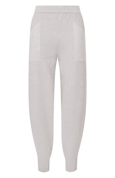 Джоггеры с жаккардовым текстовым мотивом сшили из вискозного трикотажа, усиленного полиэстером. Широкие манжеты модели, пояс и кант на двух карманах выполнили резинкой.