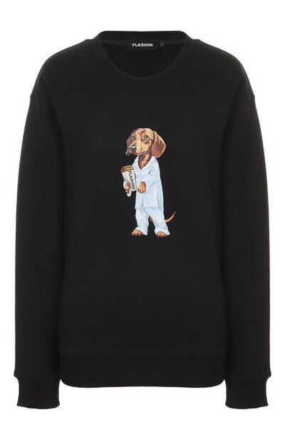 Свитшот свободного кроя сшили из хлопкового трикотажа, укрепленного полиэстером. Модель с манжетами, горловиной и поясом в рубчик украсили принтом с изображением таксы.