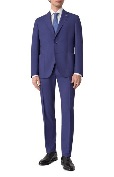 Костюм-двойку с фирменной брошью на лацкане сшили из тонкой шерстяной ткани с полутонами. Однобортный пиджак с двумя шлицами, прошитый строчкой пунто, дополнили нагрудным карманом, накладными боковыми и прорезным внутренним, а брюки со стрелками – боковыми и задними с пуговицами.