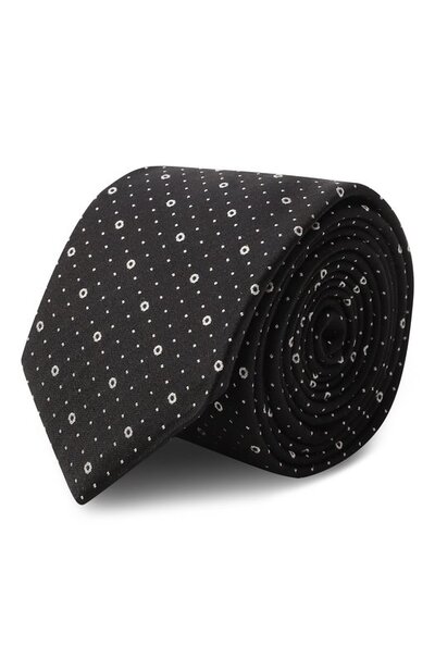 Узкий галстук с контрастным точечным узором сшили из шелкового жаккарда. Аксессуар из такой ткани с плотным переплетением нитей быстро расправляется после развязывания узла, не образуя заломов.
