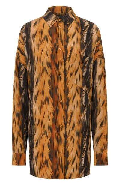 Удлиненную рубашку Cocoon силуэта oversize сшили из тонкого шелка с принтом, напоминающим длинноворсовый мех. Модель с фигурным низом и воротником button down дополнили накладным нагрудным карманом.