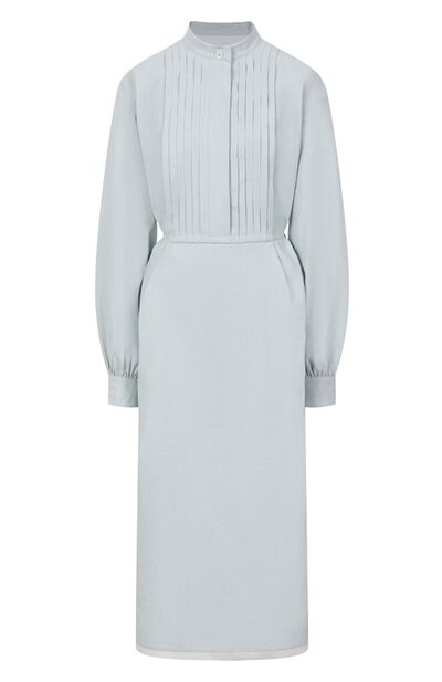 Платье-рубашка силуэта oversize удачно впишется в базовый летний гардероб. Модель с боковыми разрезами, плиссировкой на лифе и воротником «мандарин» сшили из чистого хлопка. Приталенный силуэт поможет создать узкий пояс-лента, завязывающийся сзади.