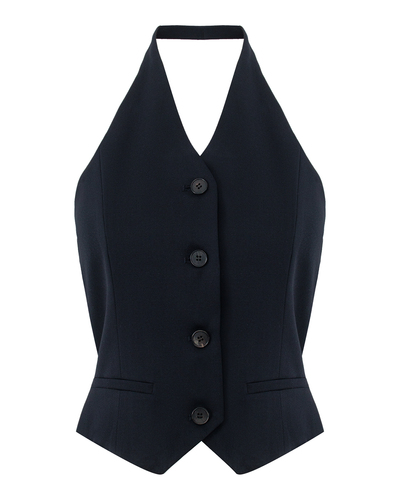 Жилет из 100% шерсти с атласной подкладкой. Приталенная модель с открытыми плечами и спиной. Застёжка на пуговицы, V-вырез и бретель халтер.