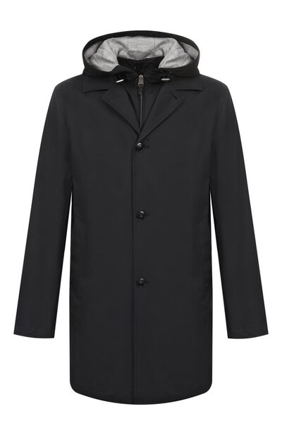 Плащ с двумя внешними и тремя внутренними карманами сшили из полиэстера с добавлением полиуретана. Сзади расположили шлицу и кожаную нашивку. Съемная манишка с регулируемым капюшоном застегивается молнией, а сама модель — пуговицами.