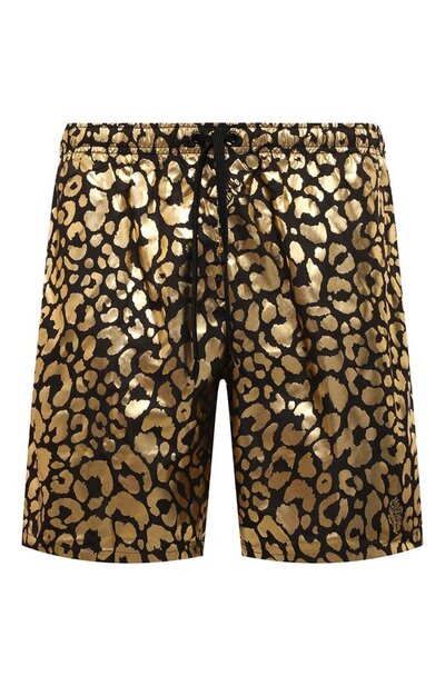 Золотистый леопардовый принт делает эти плавки-шорты максимально эффектными. Для пошива модели с правильной длиной чуть выше колена использовали легкий прочный материал, который быстро сохнет. За удобную посадку на талии отвечает широкий эластичный пояс с регулируемой кулиской.