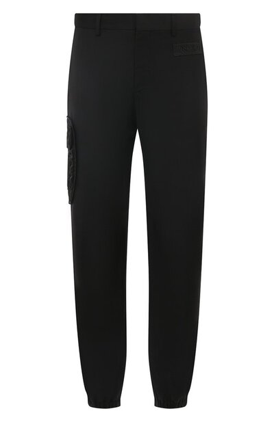 В основе черных джоггеров со шлевками для ремня — классические брюки, в манжеты которых продели эластичную ленту. Многослойный накладной карман из глянцевого нейлона придает модели сходство с карго. Для пошива изделия использовали тонкую шерстяную ткань, поддерживающую оптимальный микроклимат.