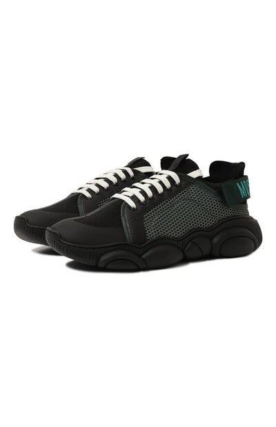 Футуристичный вид черным кроссовкам придали рельефной резиновой подошвой, в тиснении на которой угадываются очертания фирменного медвежонка. Верх выполнили из дышащей сетки и технологичных полимеров и дополнили внутренней отделкой из телячьей кожи. Плотную посадку обеспечивает широкая регулируемая лента с крупным логотипом.