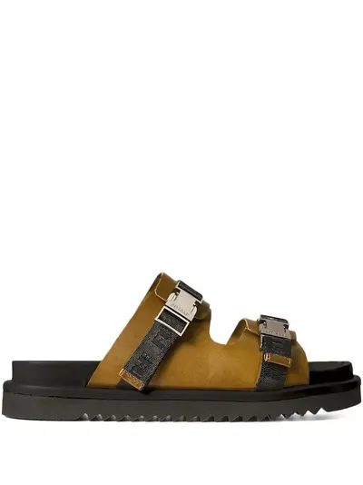olive brown double buckle fastening jacquard logo motif branded footbed flat sole