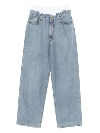 light blue front button and zip fastening elasticated waistband belt loops classic five pockets