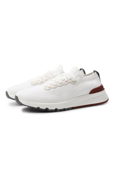 Мастера марки, основанной Брунелло Кучинелли, сшили эти белоснежные кроссовки из дышащего хлопкового трикотажа, поэтому обувь почти не ощущается на ноге. Контрастная накладка усиливает задник, а фигурные кожаные полосы укрепляют шнуровку. Легкая подошва из вспененного полимера амортизирует, смягчая шаги, поэтому модель из осенне-зимней коллекции 2020 года не позволит устать во время долгой прогулки.