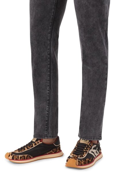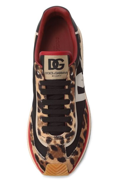 Кроссовки DG Cushion с широкой полимерной подошвой сшили из однотонного полиамида и ворсовой шкуры теленка, окрашенной под леопарда, а внутреннюю отделку выполнили из кожи ягненка. О принадлежности марке говорят патч на язычке, тисненый логотип на заднике и крупная монограмма DG сбоку.