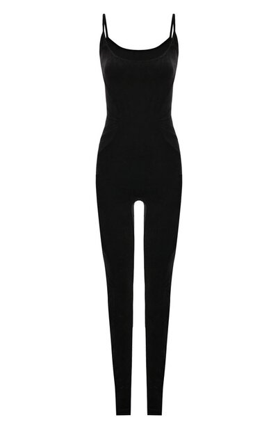 Черный комбинезон с глубоким круглым вырезом Рик Оуэнс сшил из эластичного бархатистого трикотажа, поэтому модель комфортно облегает фигуру, подчеркивая изгибы. Для производства материала использовали дышащую вискозу из древесины, заготовленной в возобновляемых лесах.
