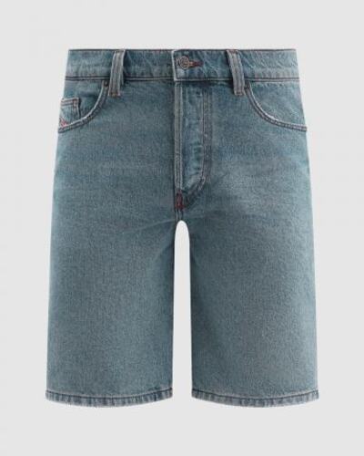 Шорты Diesel из голубого денима. Мужские шорты с пятью карманами, обычной талией и прямыми штанинами, длиной до колена. Средне-синяя потертость выполнена из 100% хлопкового денима.