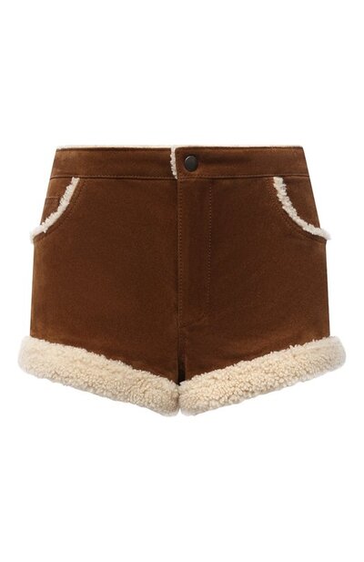 Знаковые для марки, основанной Ивом Сен-Лораном, короткие шорты в осенне-зимней коллекции приобрели новое звучание. Коричневую модель словно выполнили из дубленки. Такой эффект создает кремовая отделка из плотно скатанной овчины, которой подчеркнули края деталей. Для пошива Энтони Ваккарелло выбрал мягкую замшу, играющую естественными полутонами. Подчеркнуть вещь в образе помогут лаконичные черные футболка и сапоги.