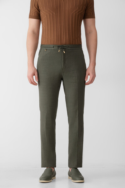 Стрейчевые брюки тёмно-зелёного цвета от Stefano Ricci. Изделие выполнено из мягкого трикотажа на основе льна и прочного вискозного волокна. Широкий эластичный пояс-кулиска обеспечивает комфорт и гарантирует удобство в носке. Модель интересна гибридным дизайном, сочетающим элементы спортивной одежды и классических чиносов, и наличием оцинкованной декоративной фурнитуры из металла золотого оттенка: деталью-восьмигранником спереди и перекрёстным лого-монограммой Дома на правом заднем кармане.