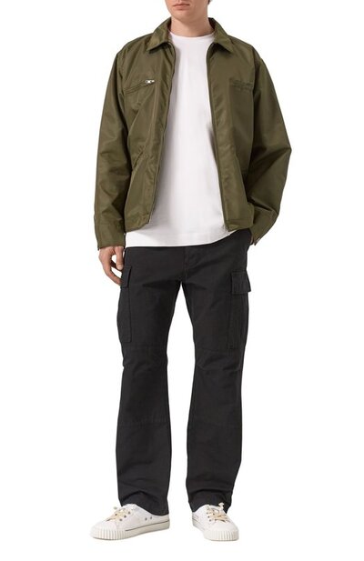 Для пошива брюк-карго с тремя парами карманов использовали хлопок. Модель с боковыми ремешками на поясе украсили фирменной горизонтальной строчкой сзади.