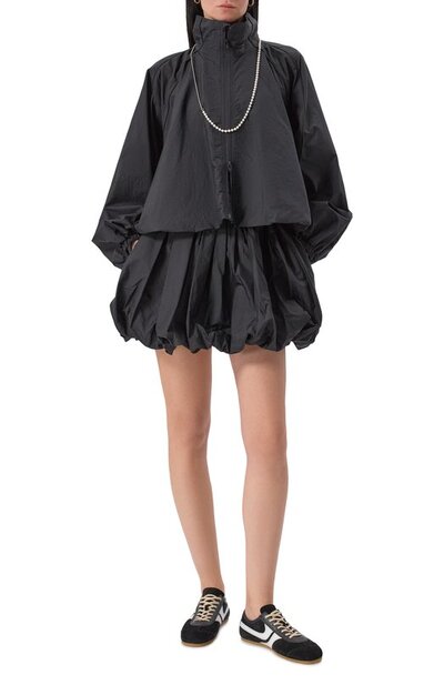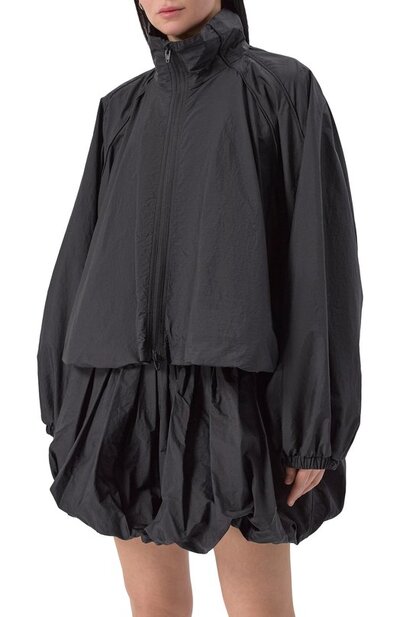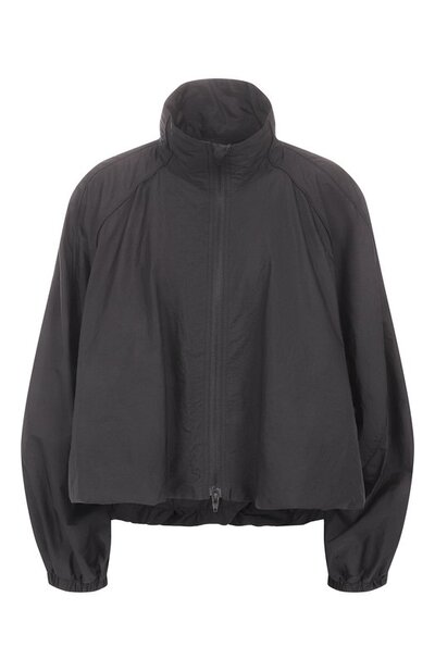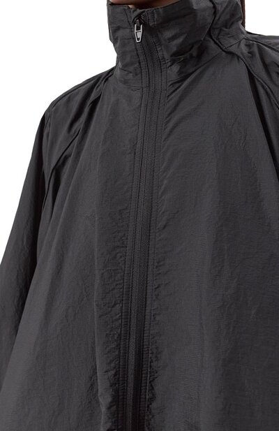Ветровку с рукавами реглан сшили из нейлонового микрорипстопа, а для подклада использовали полиэстеровую сетку. Модель с вышитым логотипом марки в тон сзади застегивается встречной молнией.