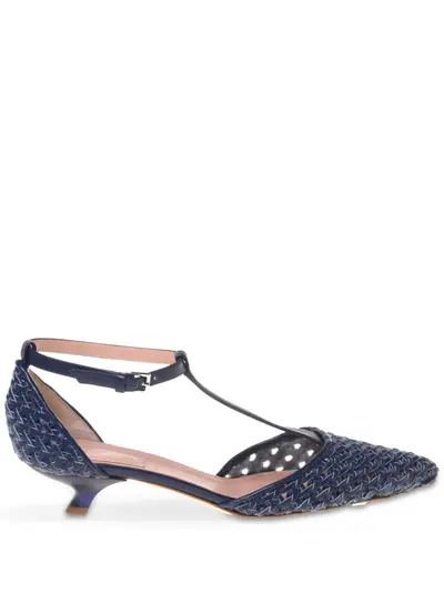 blue pointed toe buckle-fastening ankle strap branded insole kitten heel