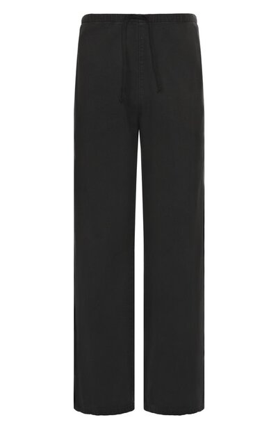 Широкие расклешенные брюки с регулируемой кулиской на узком поясе сшили из хлопкового габардина. Модель с боковыми карманами и накладным задним декорировали сзади фирменной белой строчкой.