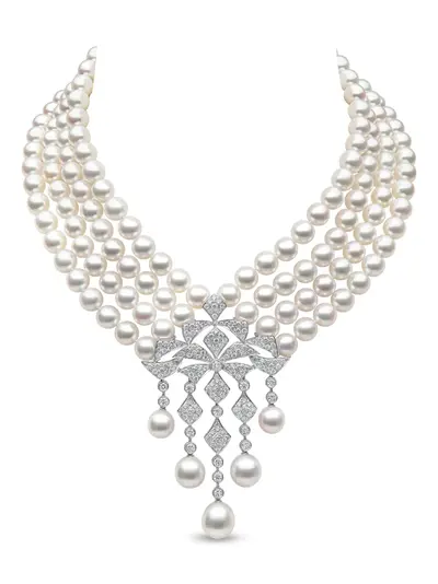18kt white gold polished finish multi-chain design bead chain statement pendant Akoya pearl South Sea pearl pavé-set round-cut diamonds bezel-set round-cut diamonds clasp fastening Normal everyday use and external agents may reduce the lustre of gemstones and gold surfaces. To maintain, use specific, non-abrasive products specially meant for cleaning jewellery. Pearls should be the last thing that you put on in the morning and the first thing you take off at night. Avoid contact with perfumes or creams, and simply wipe with a soft cloth to clean.