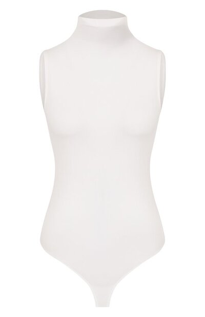 Облегающее боди с высоким воротником выполнено в технике круговой вязки из модала. Бесшовное изделие с хлопковой ластовицей застегивается плоскими кнопками.