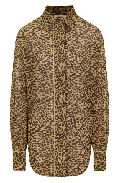 Рубашка с принтом Animalier составит летний total look с парными брюками. Модель с бантовой складкой на спинке сшили из полиамида с добавлением золотистых металлизированных нитей. Изделие с закругленной линией низа, как и высокие манжеты, застегивается обтяжными пуговицами.