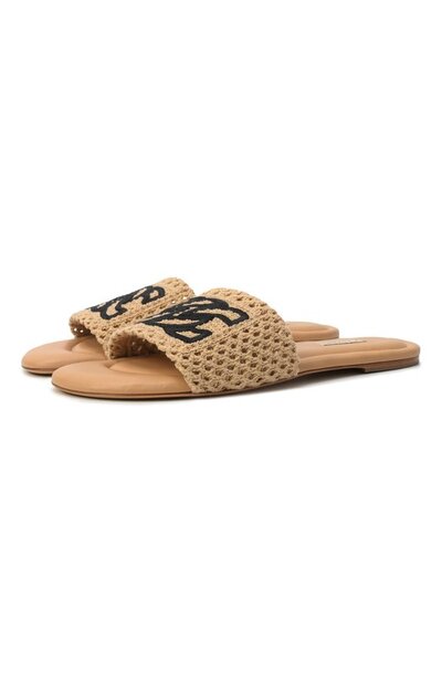 Шлепанцы Positano из капсулы Salinas связали крючком из хлопковой пряжи, усиленной нейлоном. На перемычке модели с кожаной стелькой и тонкой наборной подошвой вышили крупный контрастный мотив C-chain.