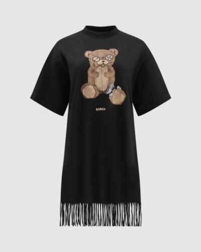 Платье-футболка Barrow в чёрном цвете поможет создать яркий летний образ с настроением легкости. Модель выполнена из 100% хлопка и дополнена бахромой. Дизайн завершает крупный принт спереди. Свободный крой платья позволит легко сочетать его с короткими шортами или леггинсами.
