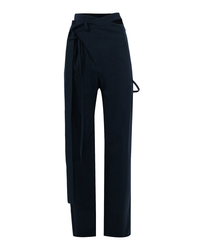 Брюки OTTOLINGER выполнены из костюмной ткани в темно-синем цвете в полоску. Уникальный дизайн с акцентом на талии, фигурным гульфиком, застежкой на запах и завязками подчеркнет вашу индивидуальность.