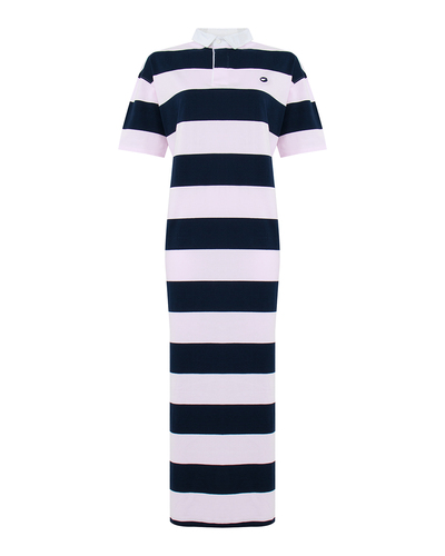 Платье-поло оверсайз кроя из плотного хлопка в полоску дополнено контрастным воротником и миниатюрным брендингом на груди.