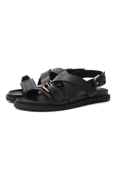 Сандалии на широкой подошве с формованной стелькой выполнили из телячьей кожи. Перемычку на мысе и открытый задник изделия дополнили регулируемыми ремешками с пряжками.