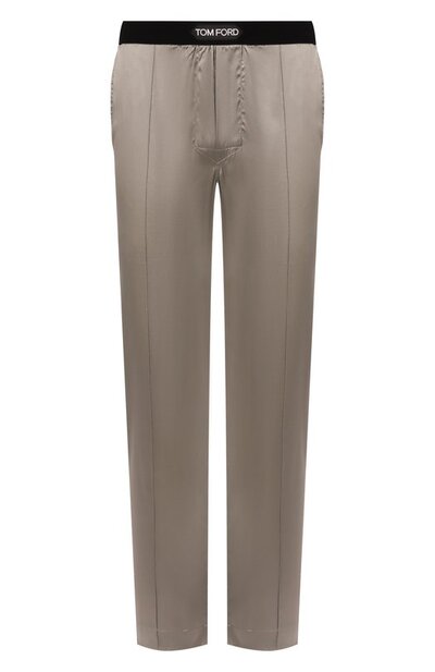 Брюки из шелкового атласа дополнили четырьмя карманами. Модель с прошитыми стрелками и имитацией ширинки комфортно садится на талии благодаря брендированному поясу из стрейчевой ленты.