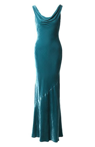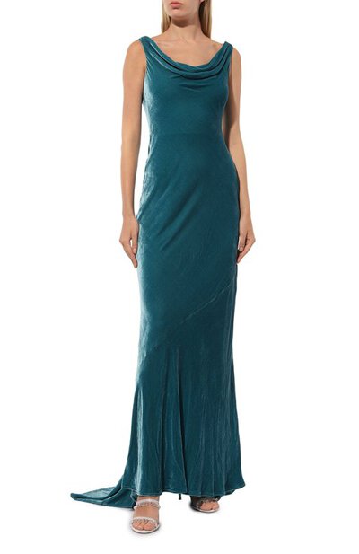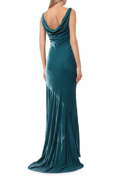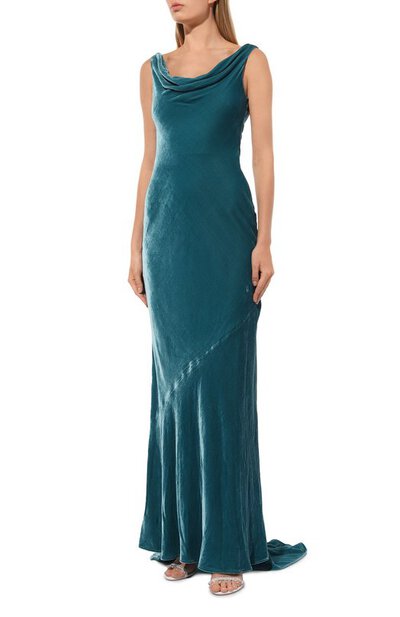 В коллекцию Asher вошло платье насыщенного бирюзового оттенка, который Салони Лодха назвала Amazonite. Облегающую модель сшили из шелковистого бархата с благородным отливом. Плотный текстиль деликатно подчеркивает декольте и ниспадает крупными плавными волнами на подоле. В одном из боковых швов скрыли молнию.